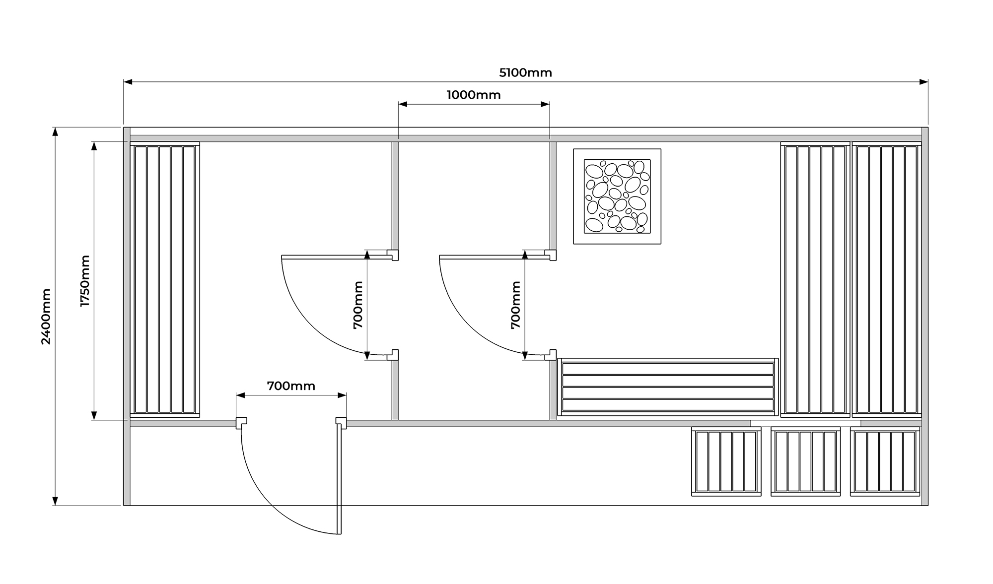 • Der Saunaraum verfügt über eine Bühne und Sitzbänke aus Erlenholz
